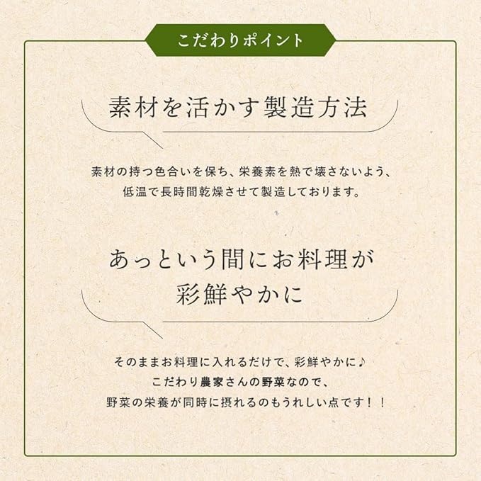 安心安全なおいしい野菜を目指し、農薬を限りなく使わない、こだわりの減農薬野菜を乾燥野菜にしております。